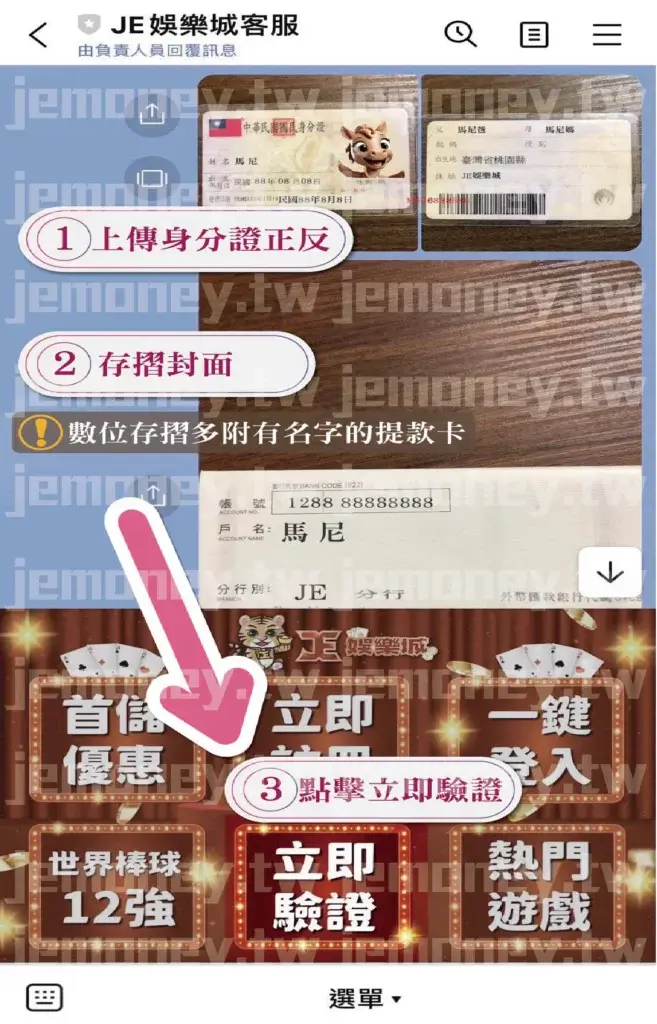 在官方 LINE 上傳「身分證正反面」和「存摺封面」(外國人士可提供「護照」進行驗證),然後點擊 LINE 選單中的「立即驗證」。完成驗證後,即可開始暢玩 財神 娛樂城。