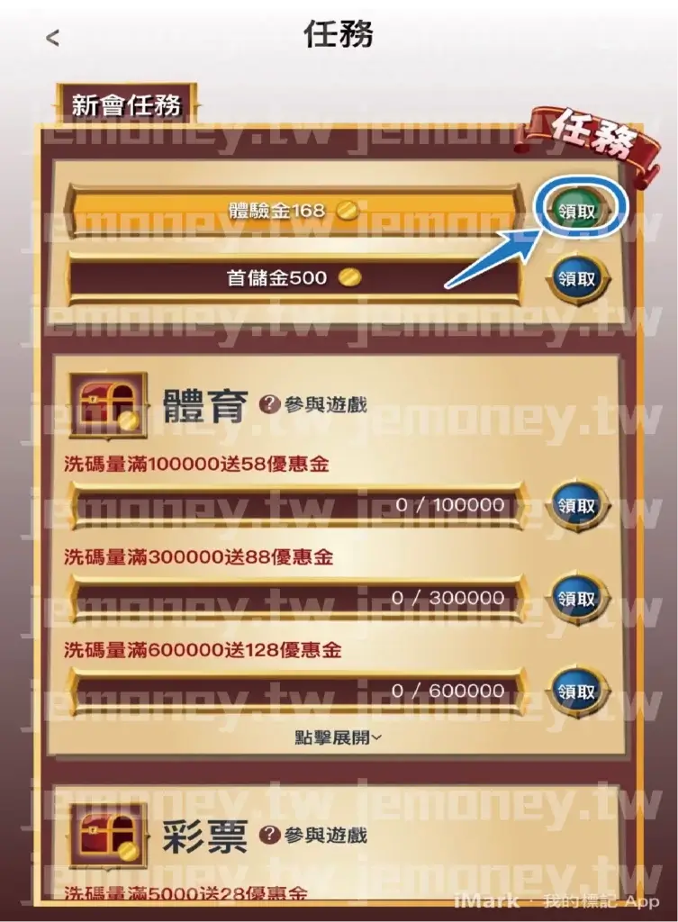 ▲進入「任務」後,點右上方「領取」拿 168 體驗金(藍色箭頭處